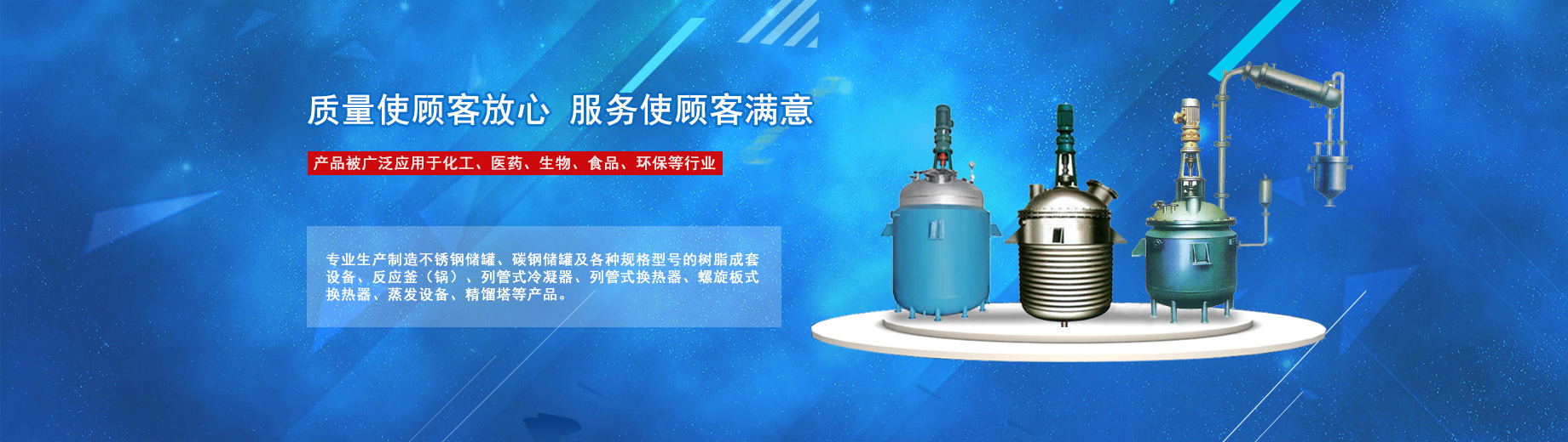 公司專業(yè)生產(chǎn)制造不銹鋼儲(chǔ)罐、碳鋼儲(chǔ)罐及各種規(guī)格型號的樹脂成套設(shè)備、反應(yīng)釜(鍋)、列管式冷凝器、列管式換熱器、螺旋板式換熱器、蒸發(fā)設(shè)備、精餾塔等產(chǎn)品,被廣泛應(yīng)用于化工、醫(yī)藥、生物、食品、環(huán)保等行業(yè)。